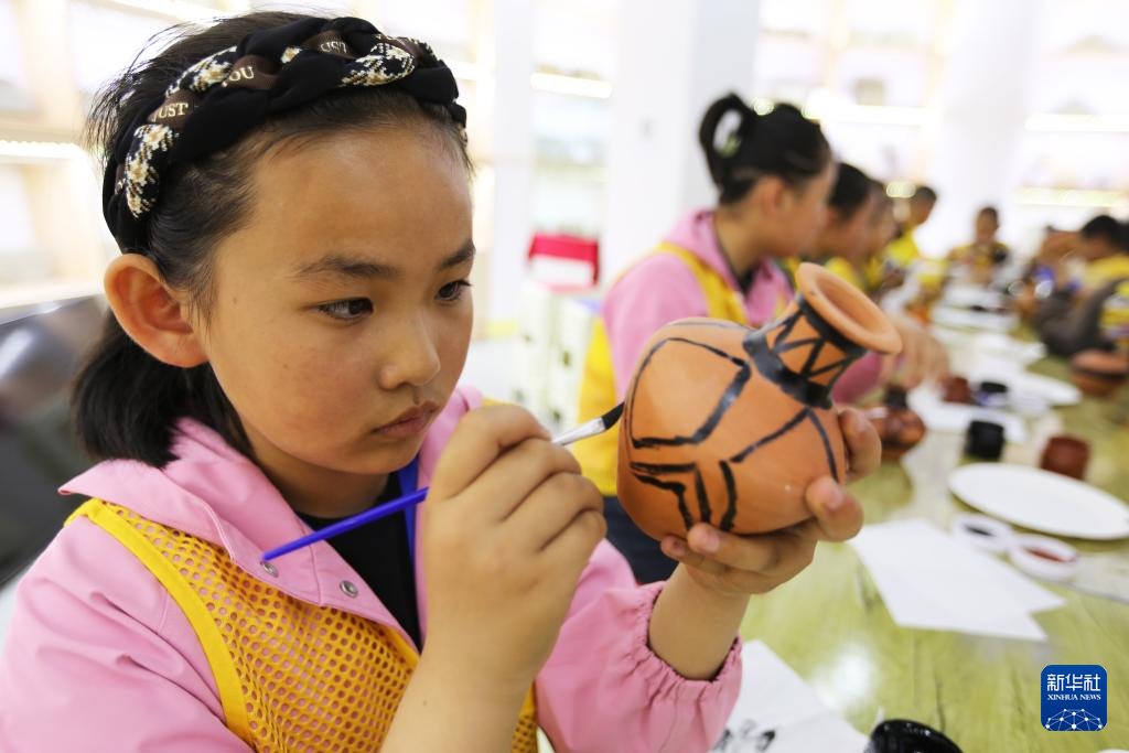 5月18日,在甘肃省定西市安定区博物馆,学生在陶罐上绘图。