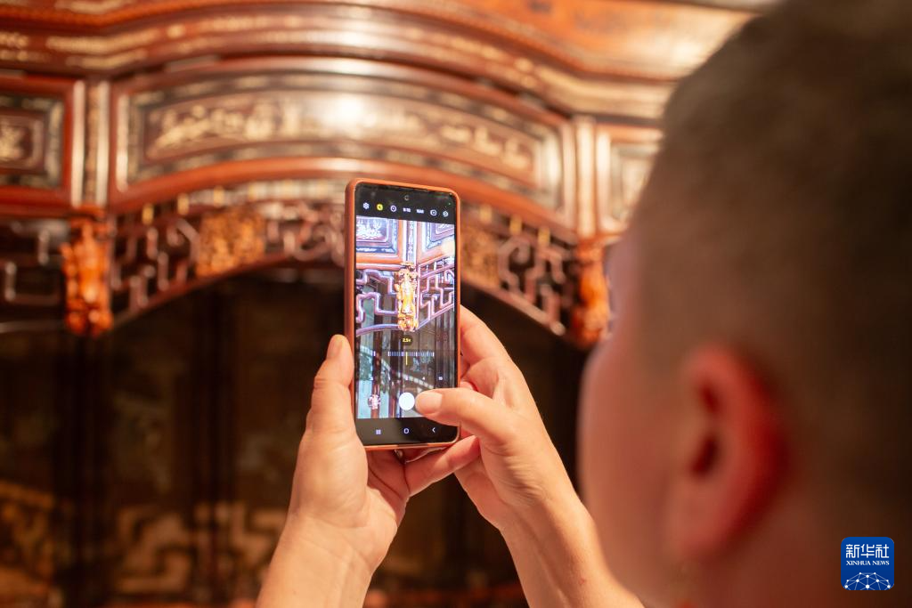 5月29日,在位于卢布尔雅那的斯洛文尼亚民族志博物馆,参观者拍摄“斯库谢克亚洲珍品文物展”上的中国古典架子床。