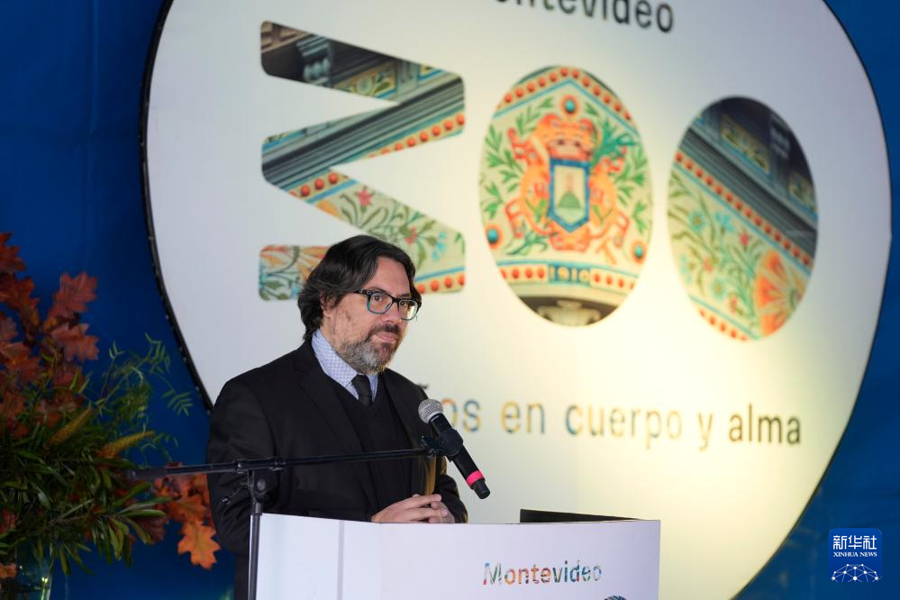 5月29日,乌拉圭蒙得维的亚市长毛里西奥·苏尼诺在巴特列公园举行的雕塑作品《问道》揭幕仪式上致辞。