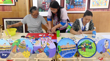 6月27日,在位于北京十里河的工作室,冀豫(左)和国家级非物质文化遗产“宫毯织造技艺”代表性传承人王国英在讨论一块宫毯的彩色样稿。