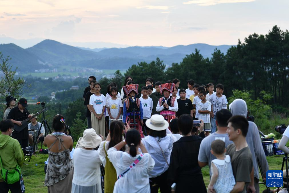 8月25日,在大元社乡村青少年艺术节上,孩子们和村里两位瑶族老人演唱瑶族歌曲。