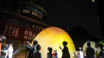 9月18日,工作人员安装调试灯光装饰艺术作品。