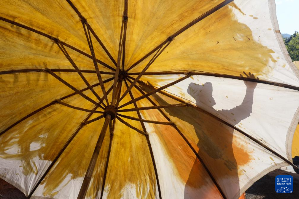 11月13日,在泾县昌桥乡孤峰村,国民油布伞厂的工人在晾晒油布伞。