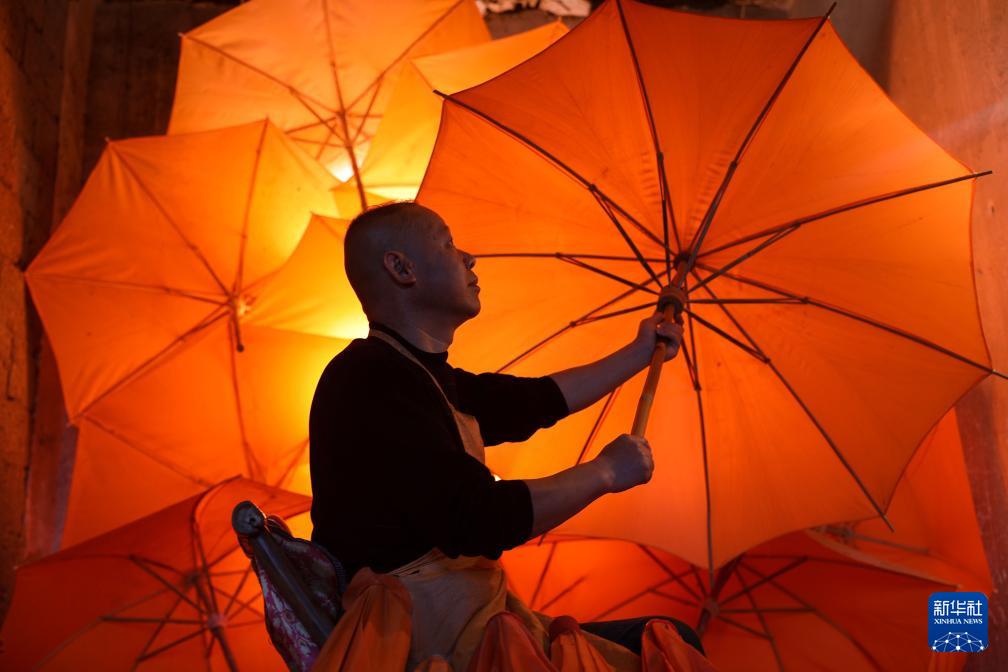 11月13日,在泾县昌桥乡孤峰村国民油布伞厂,省级非物质文化遗产传承人郑国民在检查伞面。