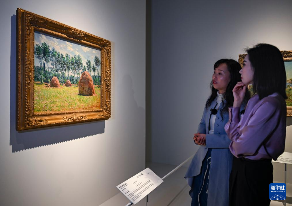 1月21日,在“印象·派对”艺术大展,媒体人员在莫奈的作品《吉维尼的干草堆》前交流。