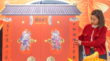 1月21日,在江苏省扬州市何园景区,游客开心地领取书法爱好者写的福字。