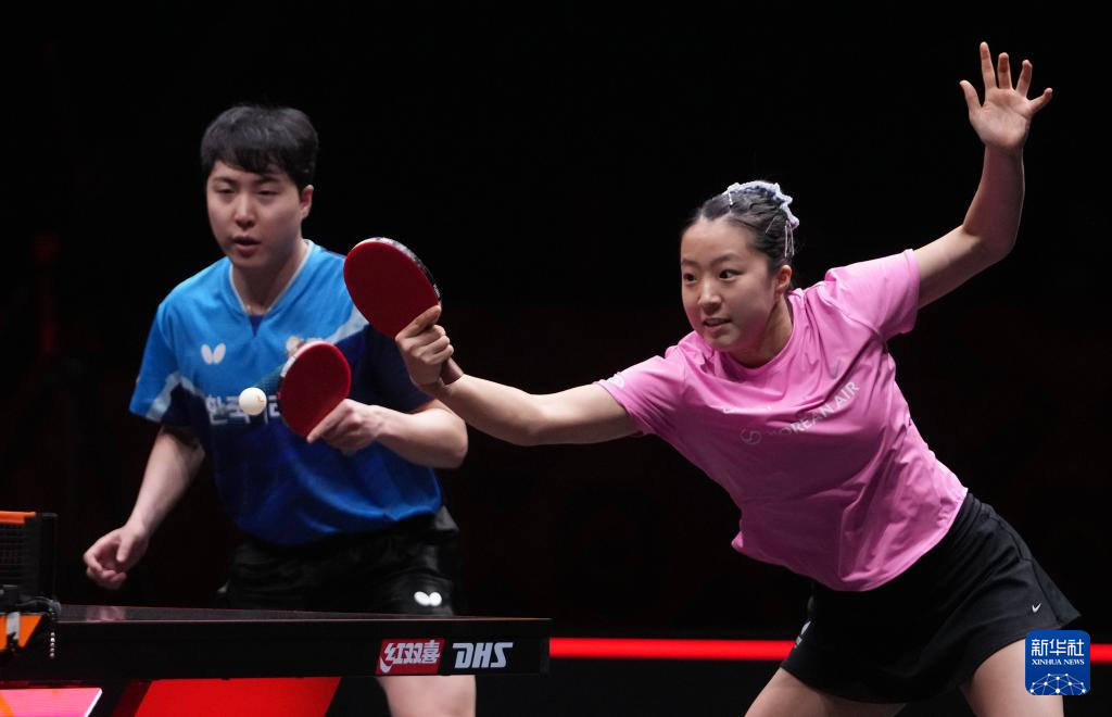 12月13日,王楚钦/孙颖莎(右)在比赛中。