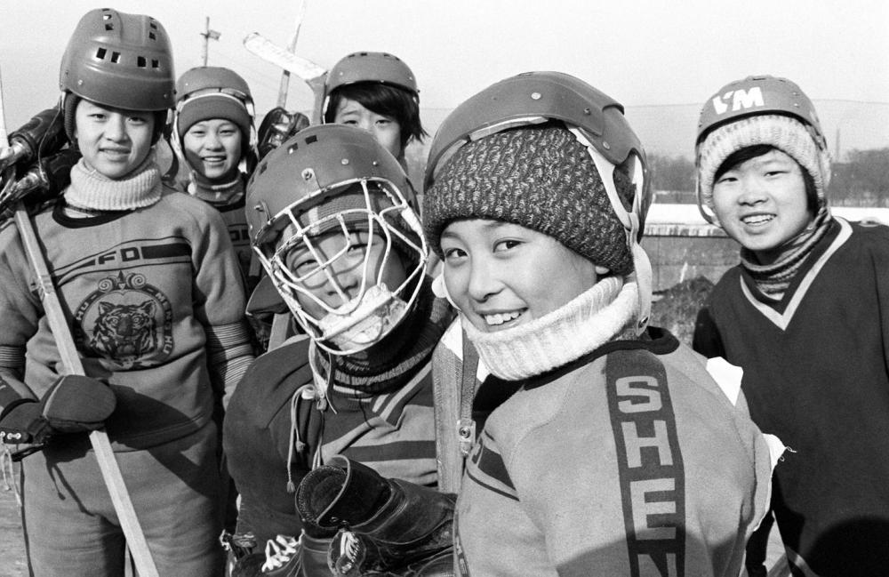 1985年拍摄的哈尔滨市南岗区女子冰球队的小队员们。新华社记者刘向阳摄