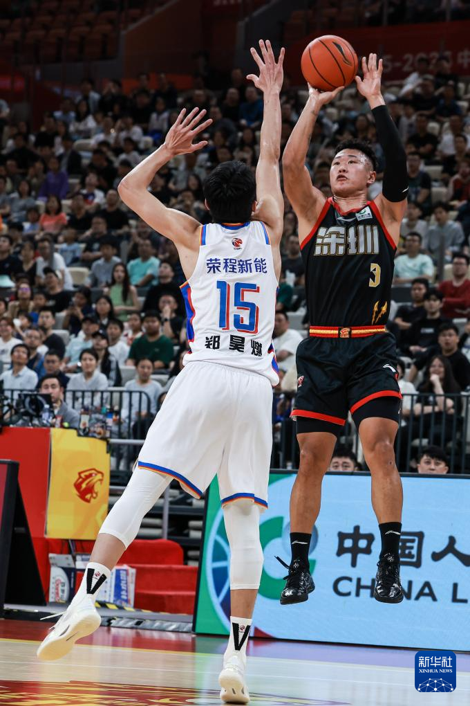 3月22日,深圳马可波罗队球员贺希宁(右)在比赛中投篮。