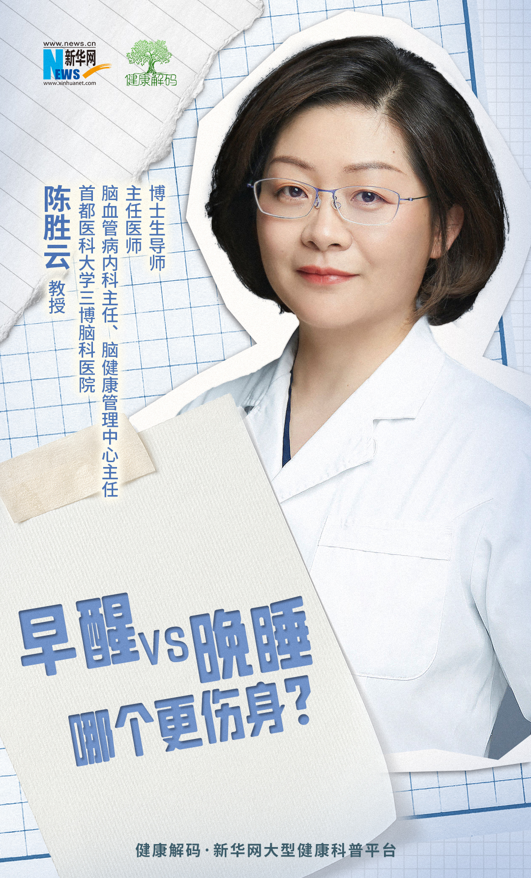 早醒和晚睡,哪个对身体的伤害更大?晚睡具体伤在哪里?早醒是‘自律’的表现吗?哪些早醒需要警惕?本集《健康解码》节目我们邀请了首都医科大学三博脑科医院脑血管病内科主任、脑健康管理中心主任、主任医师、博士生导师陈胜云教授,分享《早醒VS晚睡 哪个更伤身》。