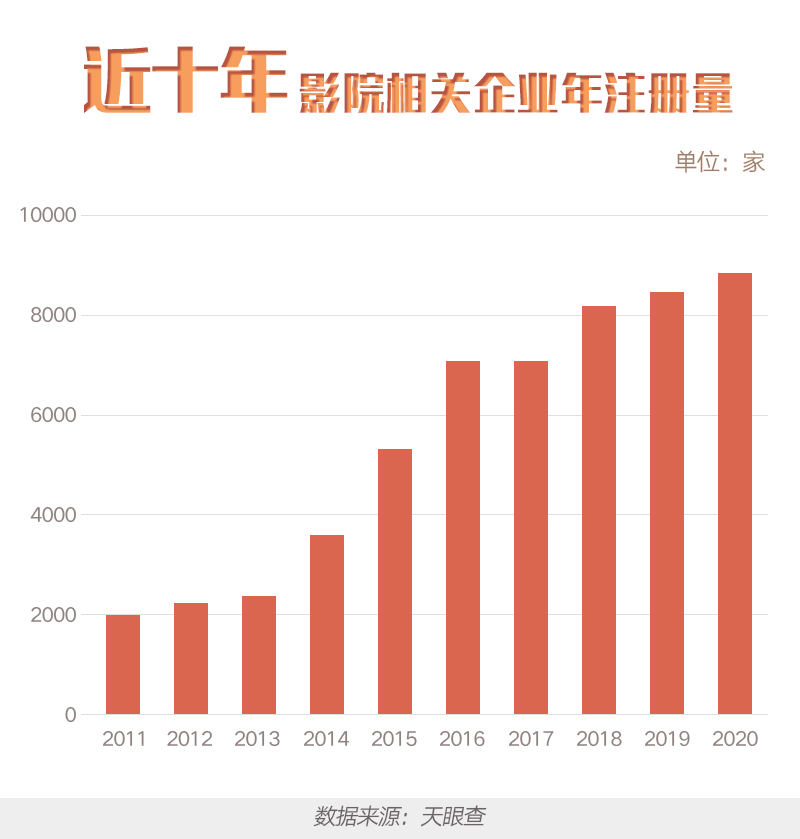 ??? 數(shù)據(jù)顯示,截至2月2日上午8時50分,春節(jié)檔電影預售總票房已達2.11億元。據(jù)天眼查大數(shù)據(jù)顯示,我國目前共有超過5.3萬家影院相關(guān)企業(yè)。其中,2020年,全國共新增超8,000家影院關(guān)聯(lián)企業(yè)。近年來,影院相關(guān)企業(yè)增速均保持在15%左右。分地域來看,全國多個一二線城市中,北京擁有的影院關(guān)聯(lián)企業(yè)最多,超3,700家,其次為深圳、廣州、上海和成都。