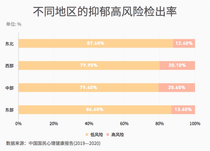 ??? 心理健康狀況受到地區(qū)經(jīng)濟發(fā)展、教育水平、醫(yī)療條件等諸多宏觀因素的影響,因此通常與這些宏觀因素一樣表現(xiàn)出地區(qū)差異。2020年度調(diào)查發(fā)現(xiàn),東部地區(qū)的總體心理健康水平更好。東部地區(qū)與東北地區(qū)的抑郁水平顯著低于中部和西部地區(qū),抑郁高風險的檢出率顯著低于中部和西部地區(qū)。