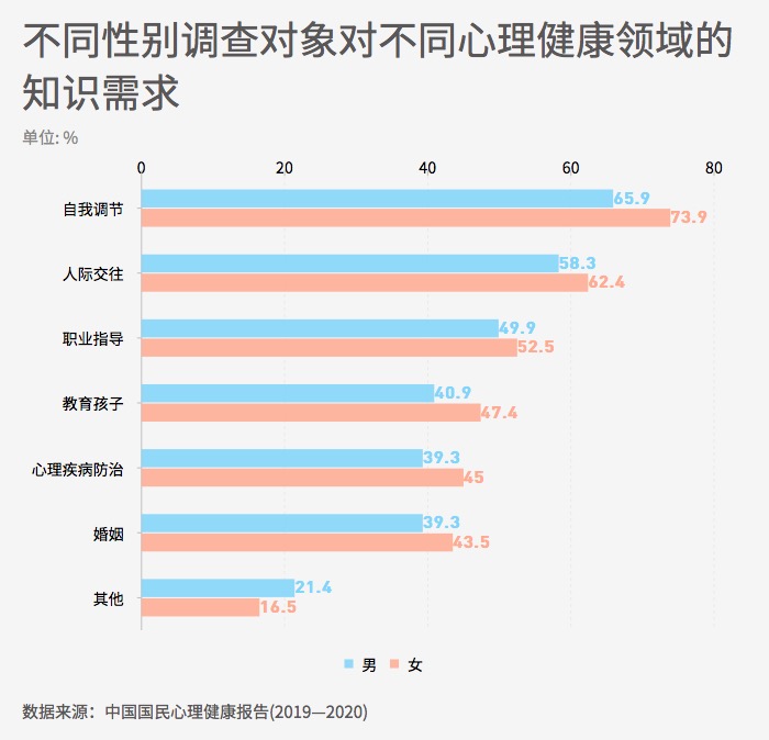 ??? 2020年調(diào)查詢問人們需要哪些方面的心理健康知識,并分析不同群體的需求特征。數(shù)據(jù)顯示,“自我調(diào)節(jié)”、“人際交往”、“職業(yè)指導”位列選擇的前三。另外,女性在各項心理健康知識的需求上的選中率均高于男性,提示著女性對心理健康知識有更主動和迫切的需求。