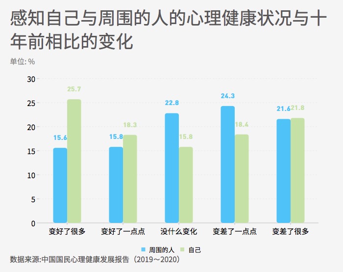 ??? 十年變遷感知調(diào)查對象認為,與十年前相比,周圍的人的心理健康狀況變好(“變好了很多”和“變好了一點點”)的比例為31.4%,認為“沒什么變化”的占22.8%,認為變差(“變差了一點點”和“變差了很多”)的占45.9%??偟膩碚f,人們在看待身邊他人狀況的時候,認為總體心理健康水平比十年前有所下降。
