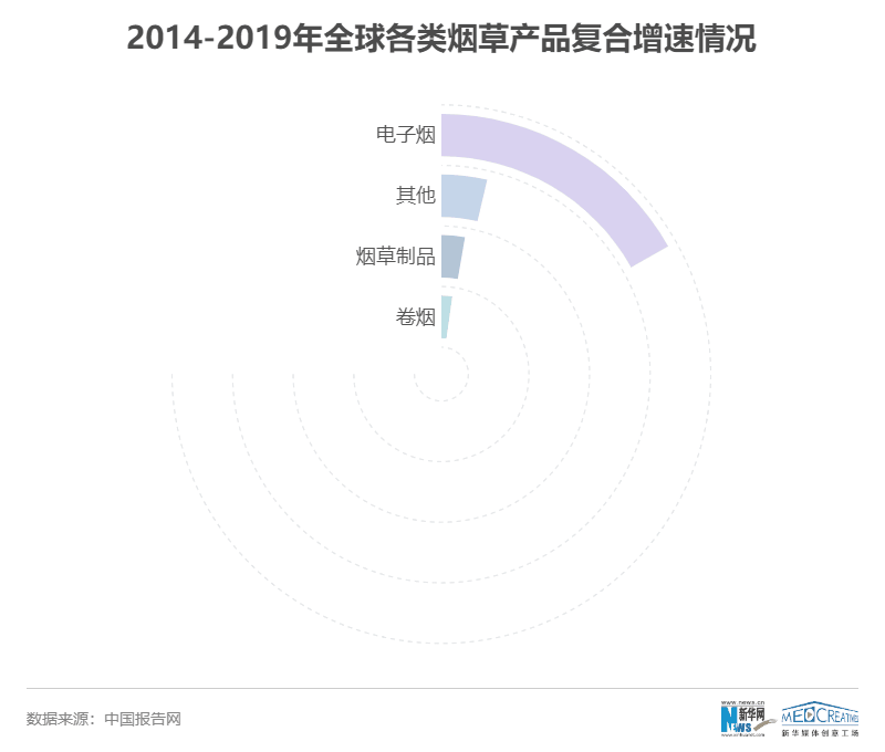 ????? 根據(jù)《2020年全球電子煙行業(yè)及細(xì)分市場(chǎng)規(guī)模、市場(chǎng)份額情況分析》報(bào)告顯示,電子煙行業(yè)增速遙遙領(lǐng)先卷煙和其他制品,其2014-2019年年復(fù)合增速達(dá)到24.2%,遠(yuǎn)高于卷煙(3.2%)和其他制品(5.3%)增速。