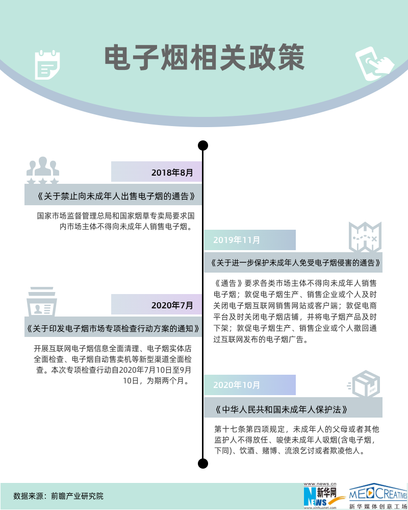 ????? 此前,我國(guó)關(guān)于電子煙的政策監(jiān)管問(wèn)題一直是懸在電子煙行業(yè)之上的“達(dá)摩克利斯之劍”。2018-2020年,我國(guó)針對(duì)電子煙逐步出臺(tái)了相關(guān)政策,尤其是對(duì)容易落入誘惑陷阱的未成年增強(qiáng)了保護(hù),并開(kāi)始禁止網(wǎng)上銷售,電子煙的監(jiān)管措施正在逐步加強(qiáng)。