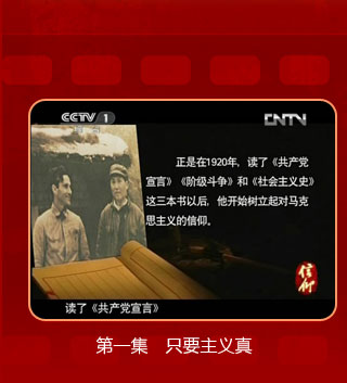 歷史文獻(xiàn)紀(jì)錄片《信仰》由中共中央組織部、中共中央文獻(xiàn)研究室、中共中央黨史研究室、中央電視臺(tái)聯(lián)合攝制。 歷史文獻(xiàn)紀(jì)錄片《信仰》,認(rèn)真貫徹落實(shí)黨的十七屆六中全會(huì)精神和胡錦濤總書記在慶祝中國(guó)共產(chǎn)黨成立90周年大會(huì)上的重要講話精神,以黨的90多年歷程為背景,以理想信念教育為主題,通過講述革命、建設(shè)、改革各個(gè)歷史時(shí)期優(yōu)秀共產(chǎn)黨員堅(jiān)持理想信念、發(fā)揮先鋒模范作用、保持先進(jìn)性和純潔性的故事,闡述了中國(guó)共產(chǎn)黨人的核心價(jià)值觀。[簡(jiǎn)介] [解說詞] |