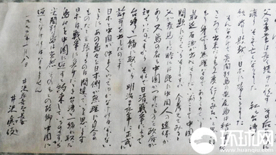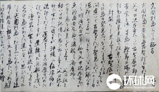 ????伊澤彌喜太長(zhǎng)女伊澤真伎1901年2月生于黃尾嶼。她于1972年1月8日口述并請(qǐng)人代筆,用毛筆寫下一份《關(guān)于尖閣列島的證言》,其中披露了其父伊澤彌喜太1891年首次登島開發(fā)一事,并明確指出釣魚島“應(yīng)該歸還給它的故鄉(xiāng)——中國”。筆者現(xiàn)將部分證言的譯文公諸于眾:“我出生于尖閣列島(譯者注:釣魚島列島)的黃尾島古賀村。父親是井澤彌喜太(注:經(jīng)核實(shí)應(yīng)為伊澤彌喜太,屬于同音字記錄筆誤)。他曾任古賀辰四郎的業(yè)務(wù)主任,在該島經(jīng)營(yíng)干制鰹魚工廠,也采集信天翁的羽毛以及貝殼等?,F(xiàn)在報(bào)紙等報(bào)道稱古賀辰四郎是第一個(gè)發(fā)現(xiàn)該島嶼的人,這是彌天大謊,是絕對(duì)不可能的事情。因?yàn)橛忻魑挠涗浛梢宰C明,我父親于明治二十四年(1891年)航行至魚釣島(即釣魚島)、黃尾島,打撈海產(chǎn)品和采集信天翁的羽毛?!赣H登島后曾對(duì)其進(jìn)行調(diào)查,期間在一個(gè)洞穴里發(fā)現(xiàn)兩具身著中國服裝的骸骨?,F(xiàn)在看來,在父親登島之前可能已有中國人達(dá)到此處。父親和古賀相識(shí)是因?yàn)楣刨R當(dāng)時(shí)很有錢,他曾主動(dòng)向父親提出:‘你在沖繩經(jīng)營(yíng)事業(yè)需要資金,我們一起合作怎么樣。’因?yàn)槭枪刨R出資,所以名義上是古賀經(jīng)營(yíng),但一切事務(wù)實(shí)際上都是由我父親全權(quán)負(fù)責(zé)的。古賀也曾說過,他允許我父親在那里自主隨意地經(jīng)營(yíng)。