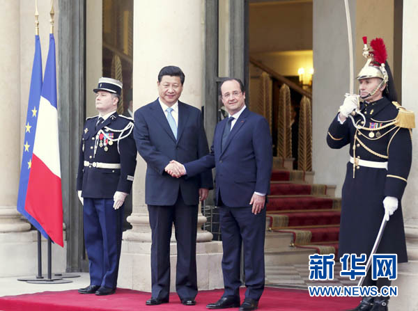 ????新華網(wǎng)巴黎3月26日電(記者陳贄 錢彤 劉華)國家主席習(xí)近平26日在巴黎同法國總統(tǒng)奧朗德舉行會(huì)談。兩國元首回顧中法建交50年的成就經(jīng)驗(yàn),規(guī)劃未來兩國關(guān)系發(fā)展,達(dá)成重要共識(shí),決定站在新的歷史起點(diǎn)上,開創(chuàng)緊密持久的中法全面戰(zhàn)略伙伴關(guān)系新時(shí)代。習(xí)近平強(qiáng)調(diào),只要中法攜起手來,必將能夠在當(dāng)前復(fù)雜多變的國際形勢(shì)下成就一番大事業(yè),開創(chuàng)新的光明前景。