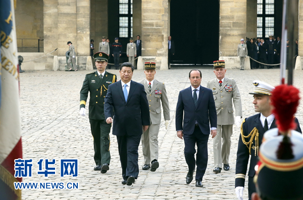 ????會(huì)談前,奧朗德在榮軍院廣場為習(xí)近平舉行隆重歡迎儀式。當(dāng)習(xí)近平和夫人彭麗媛抵達(dá)時(shí),受到奧朗德熱情迎接。在嘹亮的進(jìn)行曲中,兩國元首步入廣場。軍樂隊(duì)高奏中法兩國國歌。兩國元首檢閱共和國衛(wèi)隊(duì)和三軍儀仗隊(duì)。隨后,兩國元首來到廣場中央,觀看分列式。習(xí)近平向奧朗德介紹中方主要官員,并同法方主要官員握手問候。