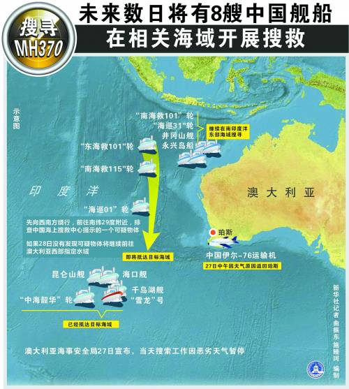 目前,馬航失聯(lián)客機搜救工作已進入第三階段。按照“明確方向、增加力量、連續(xù)作戰(zhàn)、整體推進”的部署,中國海上搜救中心進一步優(yōu)化了后續(xù)搜尋方案。我方現(xiàn)在有12艘艦船、8架艦載直升機、3架固定翼飛機已經(jīng)到達或者正在趕往南印度洋海域開展搜尋,我國已成為水面搜救主力,當前的主要任務(wù)是搜尋與失聯(lián)飛機有關(guān)的所有可疑物體。