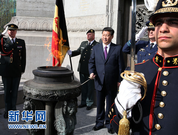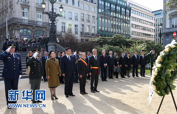 3月30日,國家主席習(xí)近平在布魯塞爾向比利時無名戰(zhàn)士墓獻(xiàn)花圈。 新華社記者 龐興雷 攝