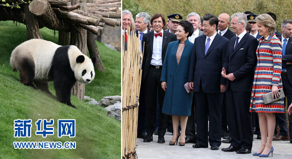 ????3月30日,國(guó)家主席習(xí)近平和比利時(shí)國(guó)王菲利普共同出席比利時(shí)天堂公園大熊貓園開園儀式。這是習(xí)近平和夫人彭麗媛同菲利普國(guó)王夫婦、比利時(shí)首相迪呂波等參觀大熊貓園(拼版照片)。 新華社記者 姚大偉 攝