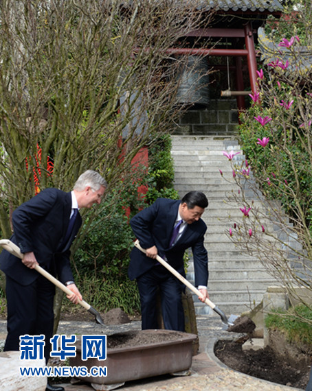 ????3月30日,國(guó)家主席習(xí)近平和比利時(shí)國(guó)王菲利普共同出席比利時(shí)天堂公園大熊貓園開園儀式。這是習(xí)近平與菲利普國(guó)王共同為一棵象征友誼的玉蘭樹培上新土。 新華社記者 馬占成 攝