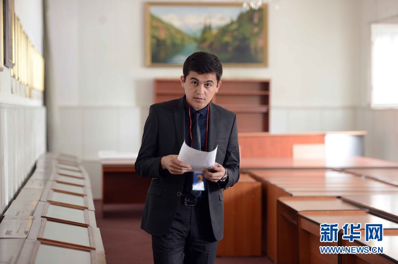 4月25日,烏茲別克斯坦塔什干國立東方學(xué)院大禮堂,世界經(jīng)濟(jì)與外交大學(xué)穆哈爾丁正在準(zhǔn)備參加比賽。