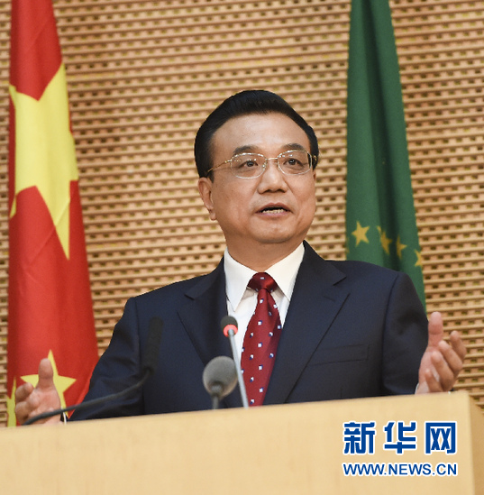 ??? 5月5日,國務(wù)院總理李克強在位于亞的斯亞貝巴的非洲聯(lián)盟總部發(fā)表題為《開創(chuàng)中非合作更加美好的未來》的演講。 新華社記者 李學(xué)仁 攝
