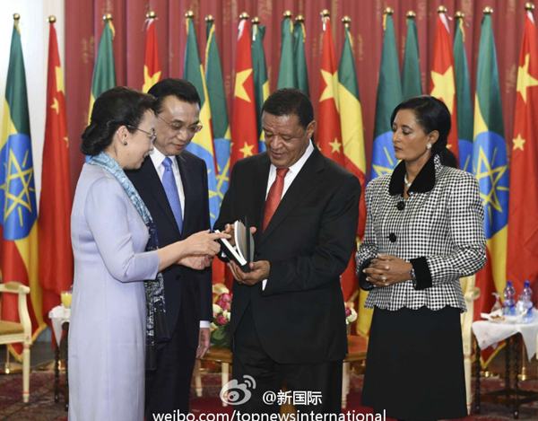 ??? 新華網(wǎng)北京5月6日電? 據(jù)新華社“新國(guó)際”微博報(bào)道,李克強(qiáng)總理與夫人程虹當(dāng)?shù)貢r(shí)間6日上午同埃塞總統(tǒng)穆拉圖夫婦在國(guó)家宮會(huì)見。會(huì)見后,程虹將自己的著作和譯著贈(zèng)送給穆拉圖總統(tǒng)夫婦。