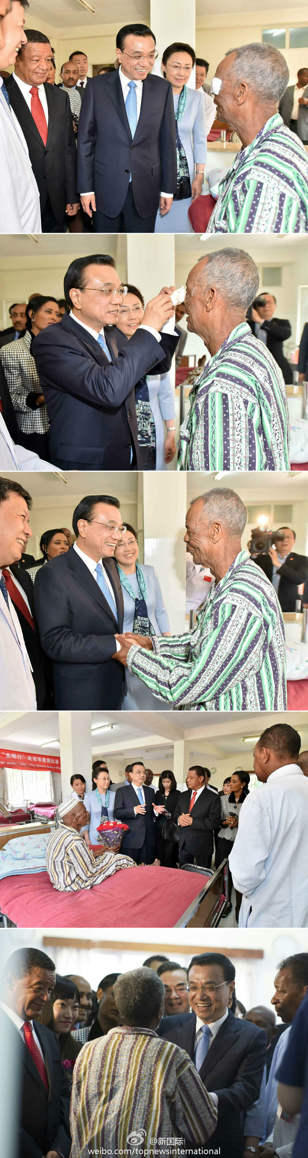 ??? 在親手為埃塞白內(nèi)障治愈患者揭開眼罩后,李克強(qiáng)說(shuō),剛才是象征性動(dòng)作,背后是中非醫(yī)生付出的艱辛和巨大努力,你們一起把光明撒向埃塞普通百姓,是光明使者和真正的天使。