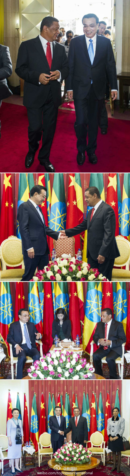 ??? 李克強(qiáng)與夫人程虹6日與埃塞俄比亞總統(tǒng)穆拉圖夫婦在總統(tǒng)官邸國(guó)家宮會(huì)見。李克強(qiáng)說(shuō),我們校友見面格外親切!總統(tǒng)先生在中國(guó)學(xué)習(xí)工作多年,為中埃、中非關(guān)系的發(fā)展作出了重要貢獻(xiàn)。穆拉圖總統(tǒng)曾在北京大學(xué)學(xué)習(xí)十余年,是李克強(qiáng)總理的校友,也是“中國(guó)通”。