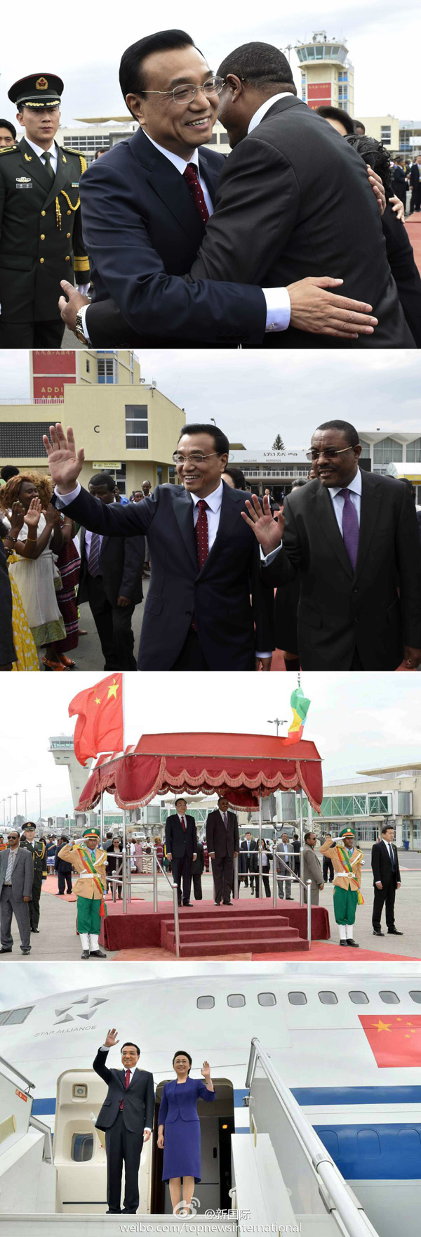 新華網(wǎng)北京5月7日電? 據(jù)新華社“新國際”微博報道,?當?shù)貢r間6日下午,李克強總理結(jié)束對埃塞俄比亞和非盟總部的訪問,乘專機離開亞的斯亞貝巴飛赴此訪非洲的第二站尼日利亞。埃塞總理海爾馬里亞姆和夫人到機場歡送,并舉行了歡送儀式。身著民族服裝的當?shù)孛癖娸d歌載舞歡送中國貴賓。