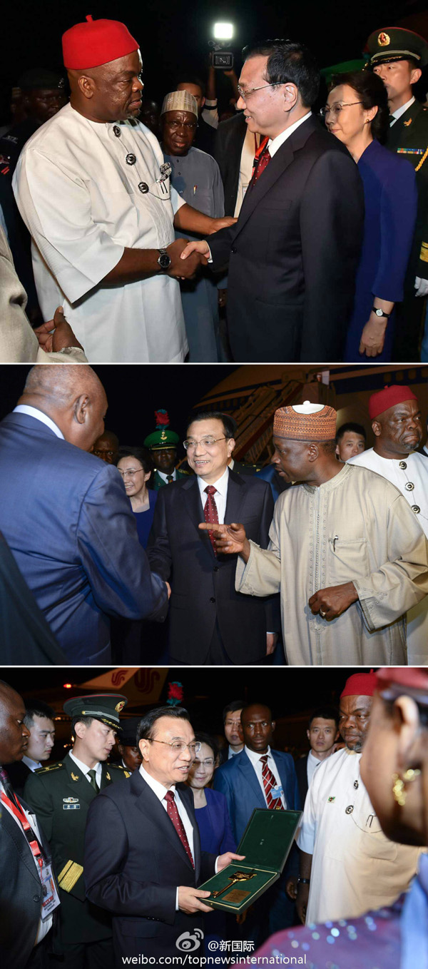 新華網(wǎng)北京5月7日電? 據(jù)新華社“新國(guó)際”微博報(bào)道,國(guó)務(wù)院總理李克強(qiáng)6日晚抵達(dá)阿布賈,開(kāi)始對(duì)尼日利亞進(jìn)行正式訪(fǎng)問(wèn)并出席第24屆世界經(jīng)濟(jì)論壇非洲峰會(huì)全會(huì)。夫人程虹同機(jī)抵達(dá)。尼外交部長(zhǎng)、勞工部長(zhǎng)到機(jī)場(chǎng)迎接,聯(lián)邦首都區(qū)部長(zhǎng)按照接待尊貴客人的傳統(tǒng)禮儀,向李克強(qiáng)贈(zèng)送了阿布賈城市鑰匙,熱烈歡迎中國(guó)總理到訪(fǎng)。