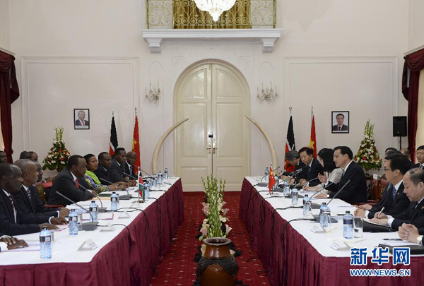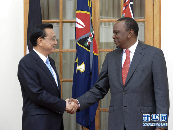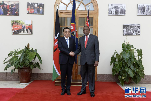 ????肯雅塔代表肯尼亞政府和人民熱烈歡迎李克強(qiáng)訪肯,表示在周恩來總理訪非50周年之際,李克強(qiáng)總理對(duì)非洲進(jìn)行的里程碑式訪問取得圓滿成功,將進(jìn)一步深化非中新型戰(zhàn)略伙伴關(guān)系??现杏兄嗤臍v史遭遇和發(fā)展任務(wù),肯方感謝中方對(duì)肯經(jīng)濟(jì)社會(huì)發(fā)展和保護(hù)生態(tài)環(huán)境、野生動(dòng)物資源的幫助和支持,高度贊賞中國(guó)為維護(hù)非洲和平與發(fā)展作出的重要貢獻(xiàn),完全贊同李克強(qiáng)總理在非盟演講中提出的“461”非中合作框架和在世界經(jīng)濟(jì)論壇非洲峰會(huì)特別致辭中提出的合作建設(shè)非洲基礎(chǔ)設(shè)施“三大網(wǎng)絡(luò)”的主張,愿與中方加強(qiáng)戰(zhàn)略溝通,全面推進(jìn)各領(lǐng)域合作,實(shí)現(xiàn)共同發(fā)展??戏皆缸鲋袊?guó)企業(yè)進(jìn)入非洲的門戶,為推動(dòng)非中合作發(fā)揮積極作用。