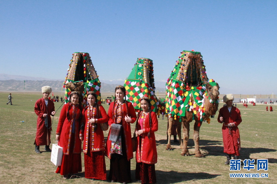 ????記者還看到過20來頭駱駝組成的駝群,其中頭駱身上綁著個(gè)布袋。駱駝低頭吃草,頭駝警覺地給它們站崗放哨。不一會(huì)兒,一些駱駝走到頭駝身前,向它施貼臉禮,頭駝一一回禮。當(dāng)記者試圖靠近時(shí),頭駝發(fā)出低沉的怪聲,群駝迅速抬起頭來,慢慢地朝遠(yuǎn)方走去。在過節(jié)時(shí),牧民小伙穿上紅色條狀長袍,頭戴白色羊羔皮帽,手牽的駱駝身上裹著人工織的毛毯,背上架著花轎,花轎中坐著美麗少女,少女頭戴小帽,梳著兩根長辮,身穿蓋過腳面的長裙。這是在給節(jié)日助興。同時(shí),這也是土庫曼斯坦民族婚禮中迎娶新娘的一個(gè)縮影。在現(xiàn)實(shí)生活中,城市人很少見到駱駝。于是在各種活動(dòng)中,跟打扮得如此漂亮的駱駝合影也是一件趣事。
