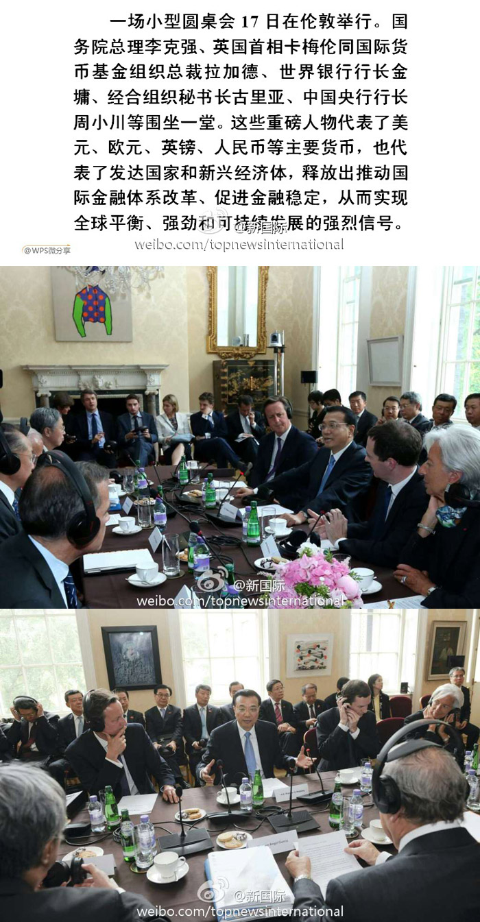 ??? 新華網(wǎng)北京6月18日電 據(jù)新華社“新國際”微博報道。一場小型圓桌會17日在倫敦舉行。國務(wù)院總理李克強、英國首相卡梅倫同國際貨幣基金組織總裁拉加德、世界銀行行長金墉、經(jīng)合組織秘書長古里亞、中國央行行長周小川等圍坐一堂。