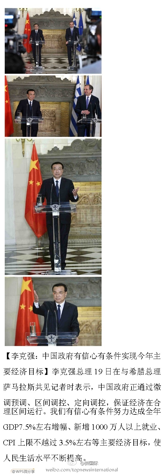 ??? 新華網(wǎng)北京6月20日電 據(jù)新華社“新國(guó)際”微博報(bào)道,李克強(qiáng)總理19日在與希臘總理薩馬拉斯共見記者時(shí)表示,中國(guó)政府正通過微調(diào)預(yù)調(diào)、區(qū)間調(diào)控、定向調(diào)控,保證經(jīng)濟(jì)在合理區(qū)間運(yùn)行。