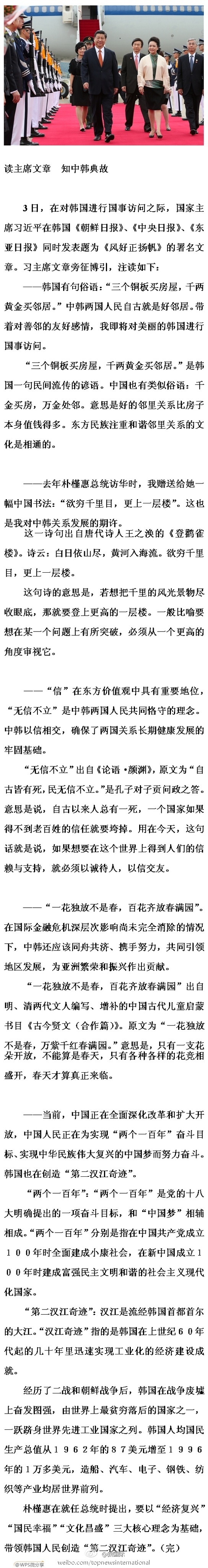 ????新華網(wǎng)北京7月4日電 據(jù)新華社“新國(guó)際”微博報(bào)道,3日,在對(duì)韓國(guó)進(jìn)行國(guó)事訪(fǎng)問(wèn)之際,國(guó)家主席習(xí)近平在韓國(guó)《朝鮮日?qǐng)?bào)》、《中央日?qǐng)?bào)》、《東亞日?qǐng)?bào)》同時(shí)發(fā)表題為《風(fēng)好正揚(yáng)帆》的署名文章。習(xí)主席文章旁征博引,注讀詳見(jiàn)長(zhǎng)微博。