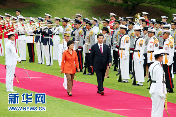 ??? 7月3日,國家主席習近平在首爾同韓國總統(tǒng)樸槿惠舉行會談。會談前,樸槿惠在青瓦臺總統(tǒng)府為習近平舉行隆重歡迎儀式。 新華社記者姚大偉攝
