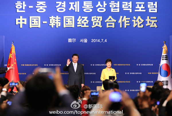 新華網(wǎng)北京7月4日電 據(jù)新華社“新國際”微博報(bào)道,習(xí)近平表示,中韓應(yīng)共同反對保護(hù)主義,兩國企業(yè)可以在制定國際標(biāo)準(zhǔn)、開拓國際市場、參與區(qū)域一體化進(jìn)程等方面加強(qiáng)探討、拓展合作。中方歡迎韓國參與亞洲基礎(chǔ)設(shè)施投資銀行籌建,共同推動(dòng)地區(qū)互聯(lián)互通和基礎(chǔ)設(shè)施建設(shè)。