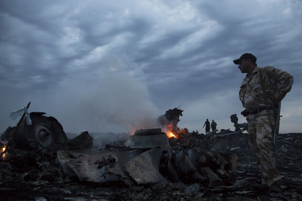 ??? 當(dāng)?shù)貢r(shí)間2014年7月17日,烏克蘭頓涅茨克地區(qū),馬來西亞航空公司波音777飛機(jī)墜毀現(xiàn)場。 圖片來源:美聯(lián)社