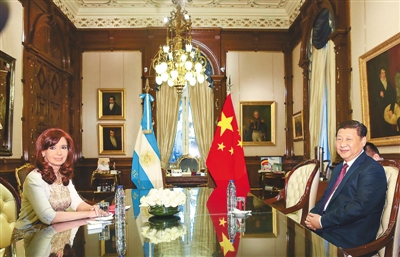 7月18日,國家主席習近平在布宜諾斯艾利斯同阿根廷總統(tǒng)克里斯蒂娜舉行會談,兩國元首就中阿關(guān)系及共同關(guān)心的問題深入交換意見,達成重要共識,一致決定將中阿關(guān)系提升為全面戰(zhàn)略伙伴關(guān)系,堅定把對方視為重要發(fā)展機遇和發(fā)展伙伴,加強互利合作和戰(zhàn)略協(xié)作,造福兩國和兩國人民,增強新興市場國家和發(fā)展中國家團結(jié)合作。