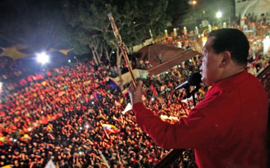 ????2012年10月7日,在得知自己成功當選總統(tǒng)后,查韋斯面對支持者們舉起了玻利瓦爾之劍