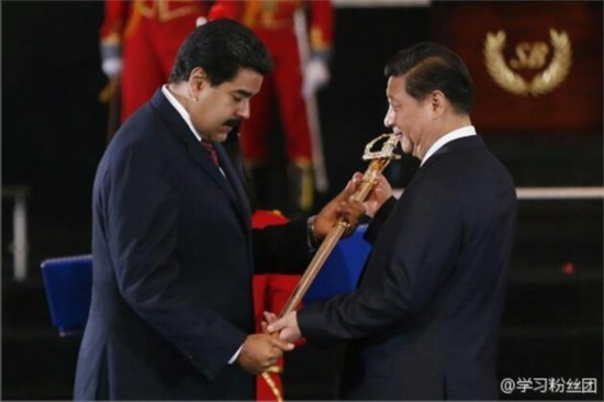 ????2014年7月20日,馬杜羅向習近平授予象征自由、主權(quán)、獨立的玻利瓦爾劍