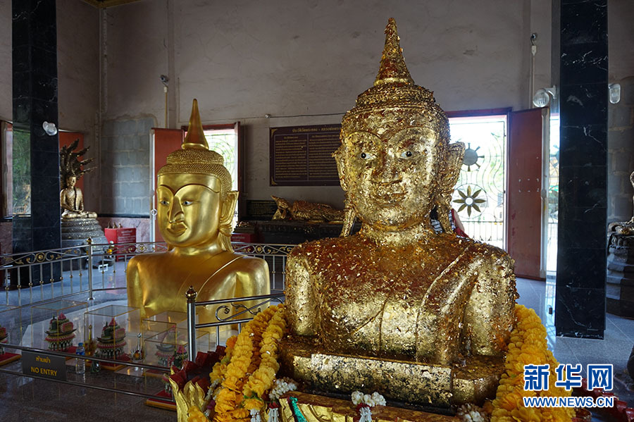 金佛寺內供奉的半身金佛(左)及被貼滿金箔的金佛模型(右) ?新華網記者 楊云燕 攝
