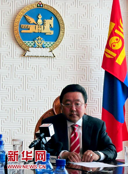 ??? 8月15日,蒙古國總統(tǒng)額勒貝格道爾吉在烏蘭巴托接受中國新聞代表團(tuán)的聯(lián)合采訪。新華社記者馮堅(jiān)攝