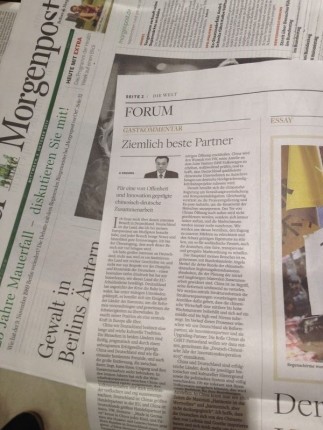 抵達(dá)前夕,克強(qiáng)總理通過(guò)德國(guó)主流媒體《世界報(bào)》,以“讓開(kāi)放創(chuàng)新引領(lǐng)中德合作”為題,向德國(guó)人民問(wèn)好并聊起對(duì)中德關(guān)系未來(lái)發(fā)展的期望。可謂是人未到,聲先至。