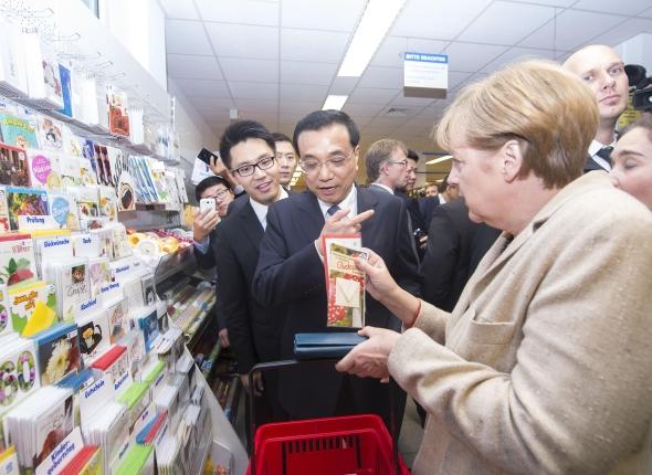 走進(jìn)超市,兩位總理邊走邊逛,默克爾不時(shí)向克強(qiáng)總理介紹貨架上的商品。在一個(gè)擺滿明信片的架子前,克強(qiáng)總理停下腳步,打算選兩張明信片送給自己的夫人和女兒。